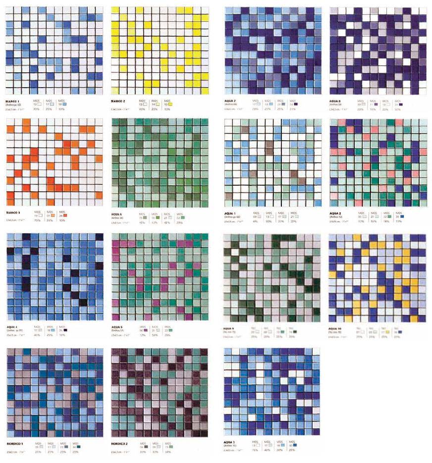 Благодаря минимальному водопоглощению, и, соответственно, морозоустойчивости широко используется для отделки бассейнов и фасадов зданий. Идеально гладкая поверхность глазури устойчива к воздействию пара, плесени и серосодержащей водной среды, что делает возможным ее применение в терапевтических зонах и детских учреждениях, а так же облегчает уход. Приятное прикосновение к мозаичному полотну обеспечивают слегка скругленные края отдельных плиточек. Это особенно важно во влажных зонах, где велика травматичность. Благодаря палитре из 37 цветов, 5 взаимосочетаемым типоразмерам и 4 типам поверхности можно создать бесконечное количество художественных композиций. Фабрика appiani предлагает 64 стандартные цветовые смеси, а так же принимает заказы на изготовление индивидуальных смесей и художественных панно из чипов размером 1,2*1,2см. Мозаика appiani обладает высокой степенью износоустойчивости и прочности поверхности. Специально для влажных зон, ступеней и наклонных полов выпускается противоскользящая серия. Возможные зоны применения: бассейны, сауны, турецкие бани, больницы, детские учреждения, рестораны, супермаркеты, фасады жилых и общественных зданий. Примечание: Цены на мозаику “appiani” уточняйте у менеджеров. |