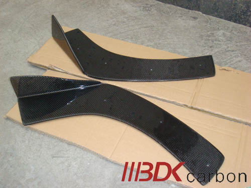 Карбоновые сплиттеры (комплект 2 штуки) предназначены для установки по углам бампера внизу и являются аэродинамической плоскостью, служащей для ограничения поступления воздуха под днище, и соответственно, создания разряжения под ним. Материал изделия - сухой карбон, покрытый финишным слоем прозрачного гелькоута. Плетение углеволокна - твилл ("ёлочка"). Имеют установочные отверстия - крепление к бамперу осуществляется заклёпками либо саморезами.