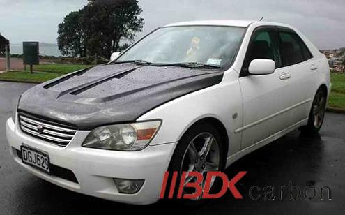 Карбоновый капот с теплоотводами на а/м Toyota Altezza. Материал изделия - сухой карбон, покрытый финишным слоем прозрачного гелькоута. Плетение углеволокна - твилл ("ёлочка"). Высокое качество, низкий вес и превосходный внешний вид.