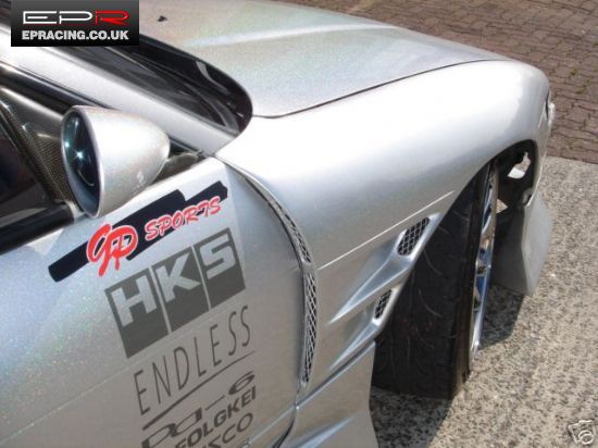 Комплект расширенных (+40мм) пластиковых передних крыльев на а/м Nissan Silvia S13. Материал изделия - высококачественный стеклопластик, покрытый финишным слоем белого гелькоута. Возможно два варианта дизайна воздуховодов. Отличное качество, установка полностью bolt-on без каких либо доработок и переделок.