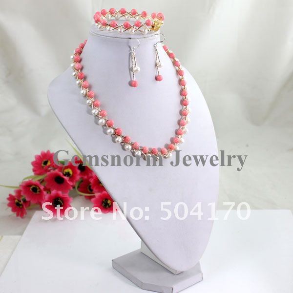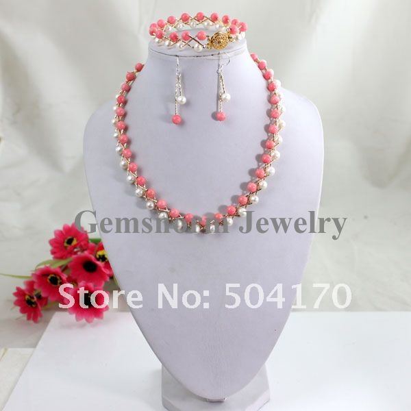 | | Набор из розового коралла и жемчуга (ожерелье, серьги, браслет) |
