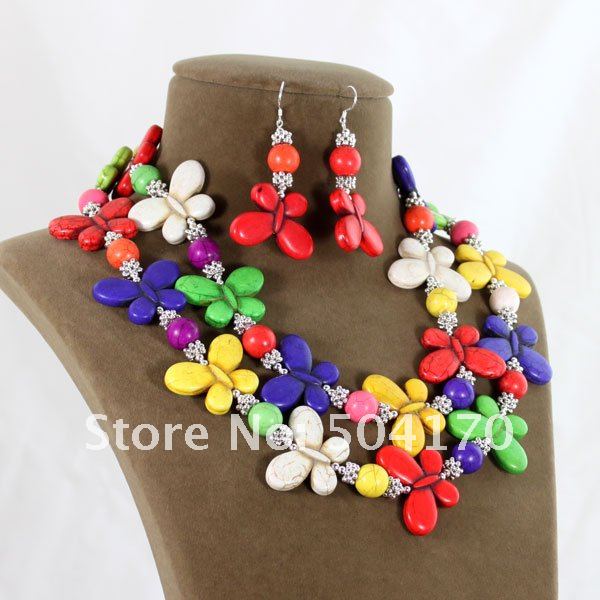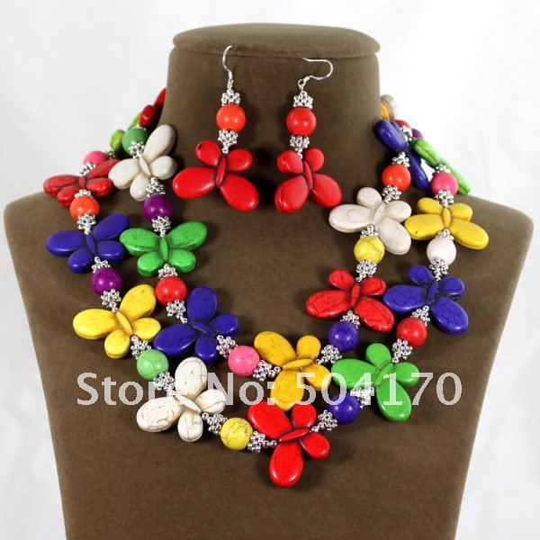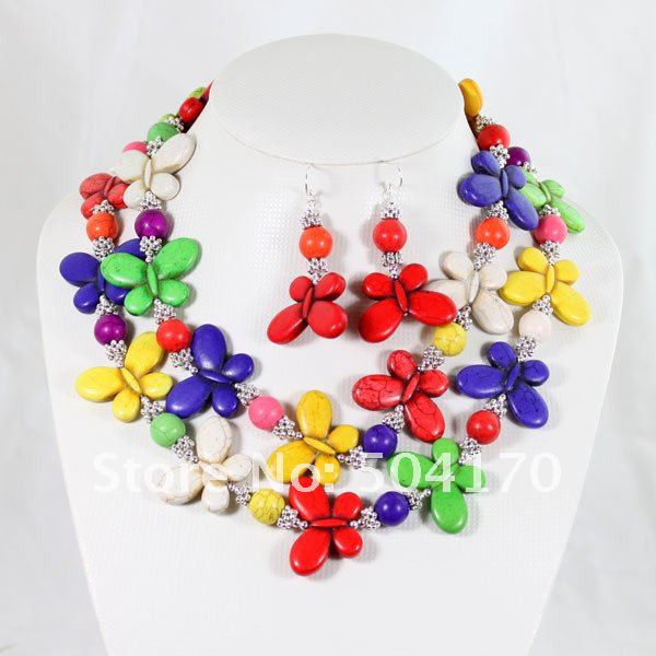 | | Ожерелье и серьги из разноцветной бирюзы с бабочками. |