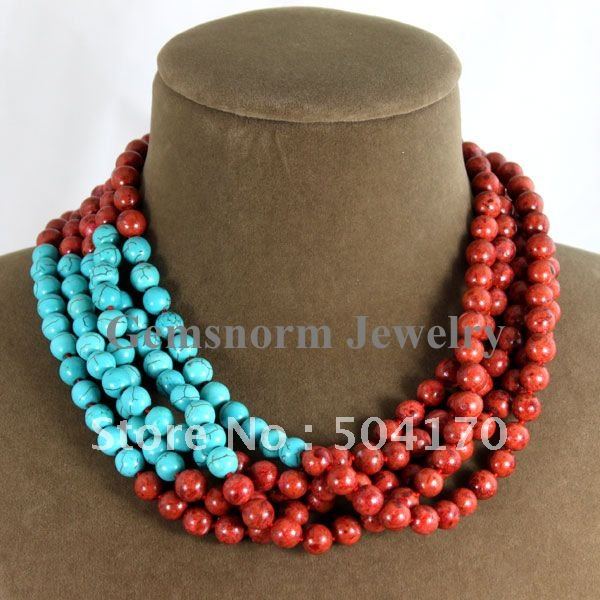 Ожерелье из бирюзы и коралла в 5 нитей. Размер бусин 10 мм.