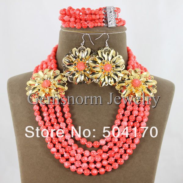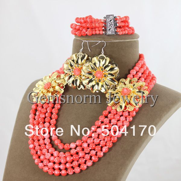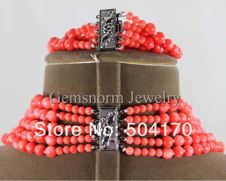 Романтический комплект ювелирной моды из розового коралла в 5 нитей.
