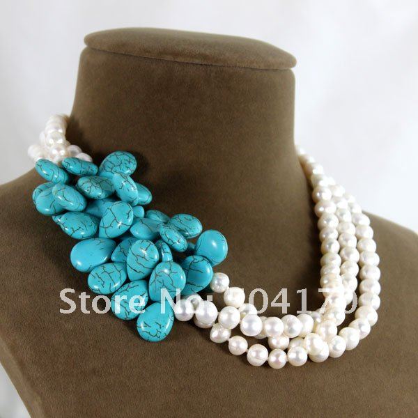 Ожерелье из 3 нитей белого жемчуга и бирюзы